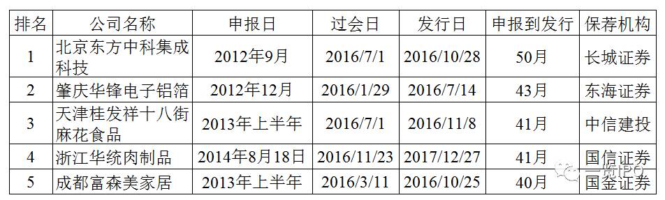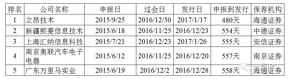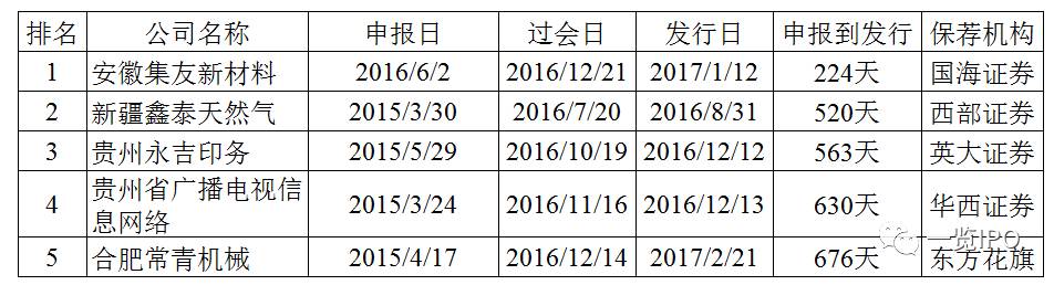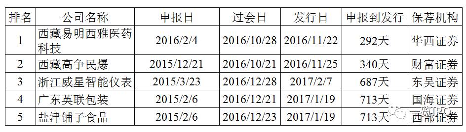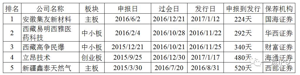 2016年IPO最顺利的企业为安徽集友新材料股份有限公司,该公司2016年6月份申报IPO,2016年12月过会,2017年1月发行,申报到过会仅等了6个月,过会到发行仅等了2个星期。当然,集友新材是搭乘了IPO扶贫的政策红利,其注册地位于安徽省安庆市太湖经济开发区,为国家级贫困县地区企业。除集友新材外,排队时间最短的其他四家企业注册地均位于西藏或者新疆,均享受了优先审核的政策,保荐机构主要为中小券商。