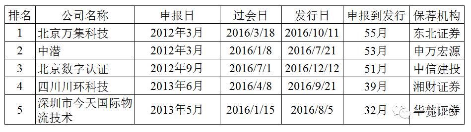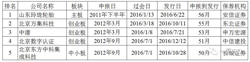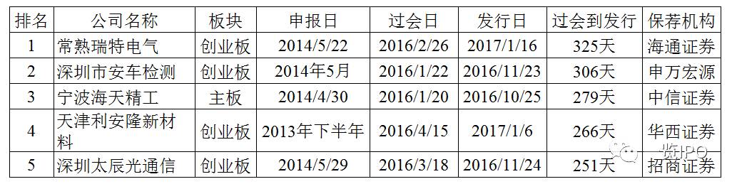 2016年不乏过会后仍然迟迟不能发行的企业,其中瑞特电气和安车检测过会后近一年才得以发行,可谓在发行上市的最后一关苦苦等待。这类企业通常是因为竞争对手、媒体的举报或者未决诉讼所致。当然,最后一关最苦命的要数乔丹体育,该企业2011年11月即过会,因为商标诉讼问题到目前仍未发行。2016年过会后拿到批文最为漫长的五家企业具体如下: