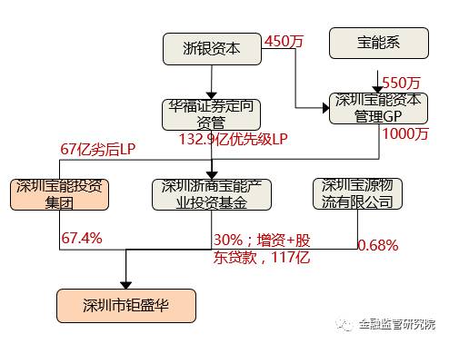 在这个投资结构中,“深圳浙商宝能产业投资基金”其实是一个有限合伙,其全名为“深圳市浙商宝能产业投资合伙企业(有限合伙)”。该有限合伙的两个LP分别是深圳宝能投资集团和华福证券定向资管,GP是深圳宝能资本管理。该基金在两个LP中作了优先劣后安排,杠杆比例大约为2:1。
