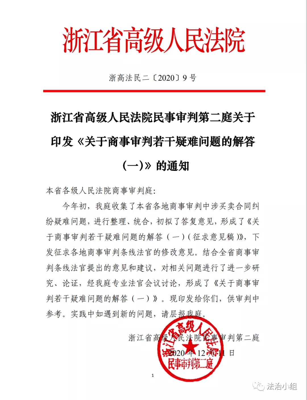 浙江高院发布《关于商事审判若干疑难问题的解答(一)》
