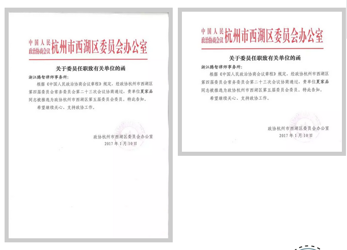 2017年1月10日,经政协杭州市西湖区第四届委员会常务委员会第二十三次会议协商通过,浙江腾智律师事务所副主任、高级合伙人夏家品律师被推选为政协杭州市西湖区第五届委员会委员。