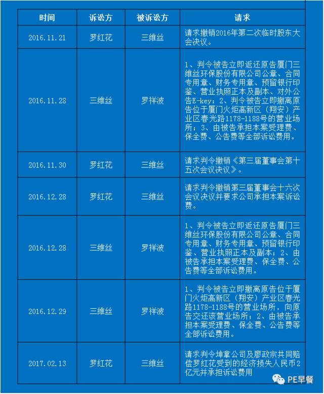 对于此次管理层变动,罗祥波认为这是廖政宗、丘国强等人精心策划的结果,不承认自己被罢免董事长职务的股东会决议的法律效力。因此,三维丝现存在两个董事会,一个是以罗祥波为首的原董事会,一个是以廖政宗为首的新董事会。由于双方争执不下,三维丝内部打起了诉讼战。而厦门市翔安区人民法院对于相关案件均正式立案受理,但尚未进入审理等程序。